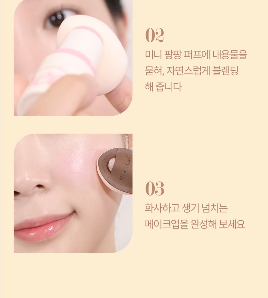 The MAKEheal Mini Pang Pang Puff Set includes compact, soft puffs designed for easy and precise makeup application. Ideal for powders, blush, or highlighter, these puffs help you blend and set your makeup seamlessly. Their portable size makes them perfect for quick touch-ups anytime, ensuring a smooth, polished look wherever you are.