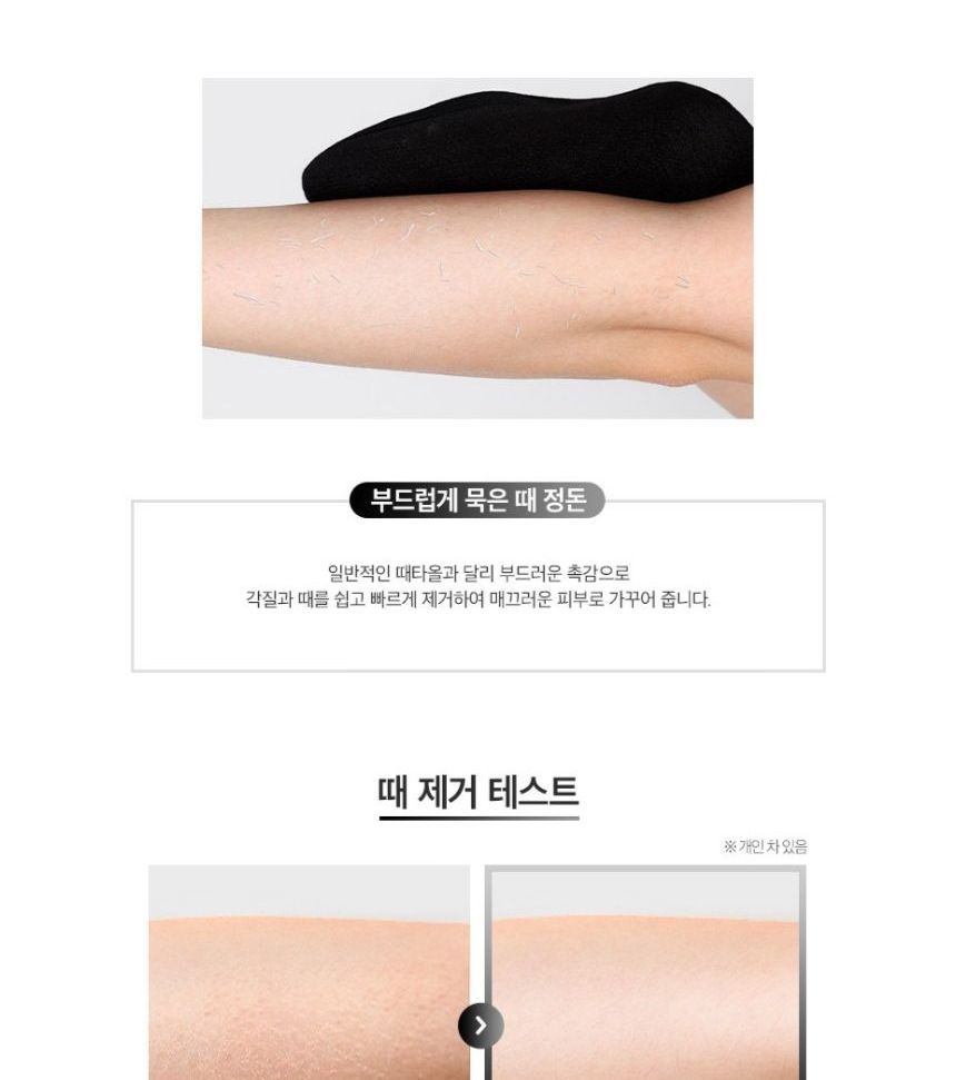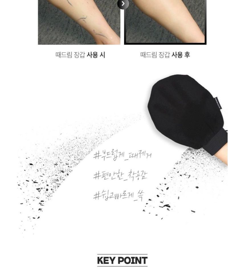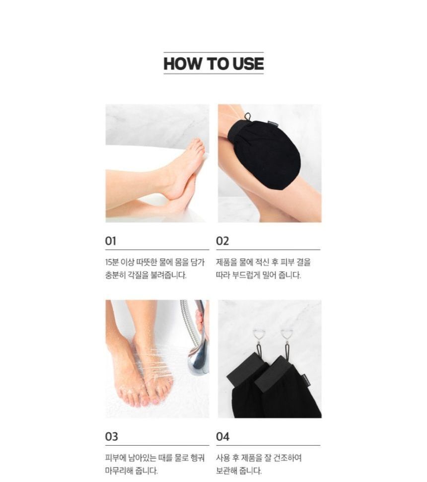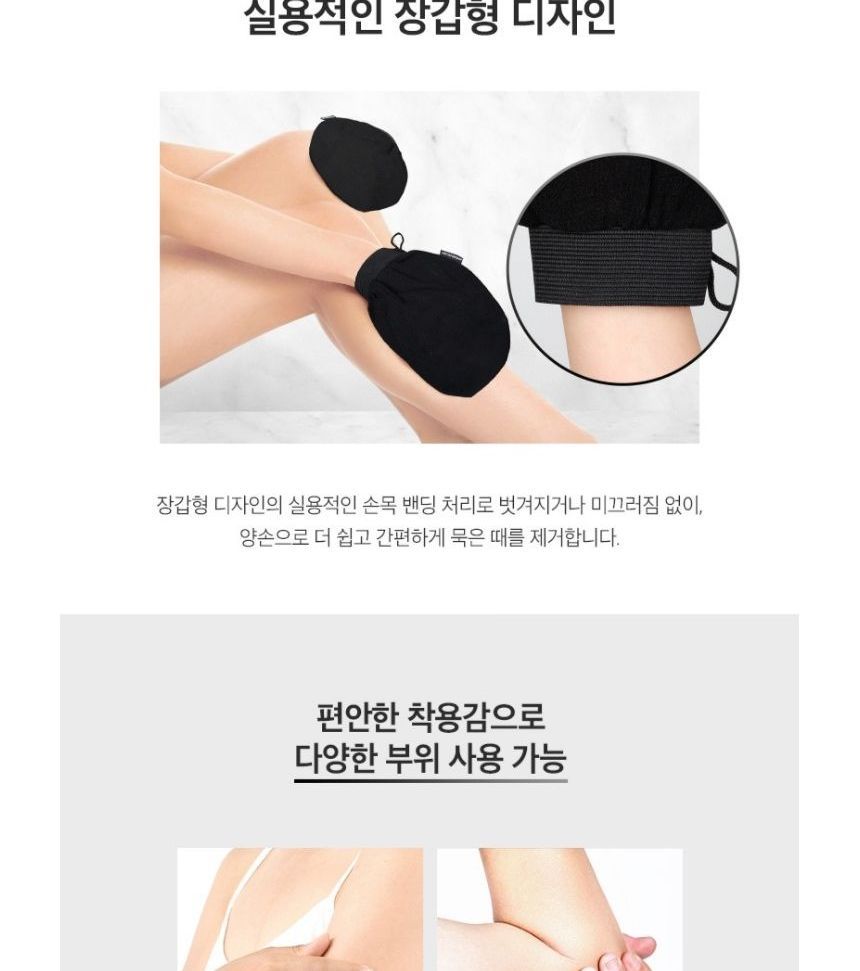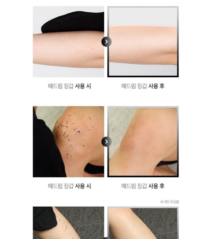 How to use: 1. Soak your skin into water for at least 15 minutes before use. 2. Dampen the gloves and gently massage. 3. Rinse with lukewarm water to clean the residue. 4. Apply a thicker layer of body lotion or body cream to moisturize the exfoliated area. |