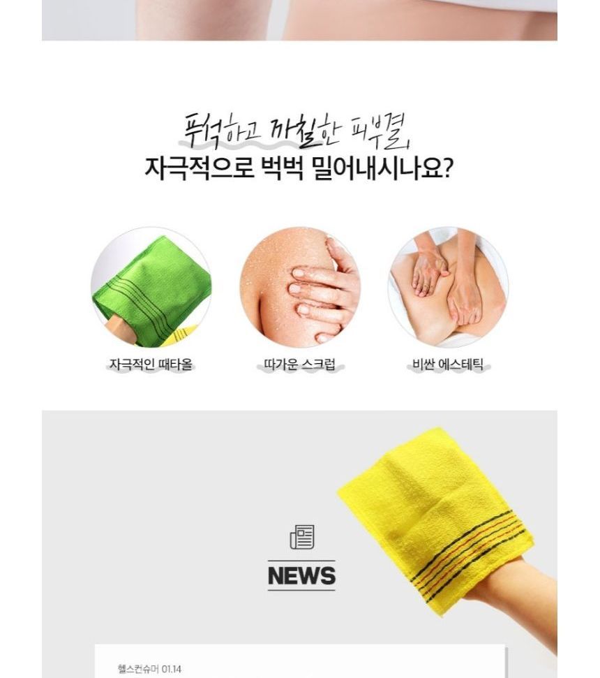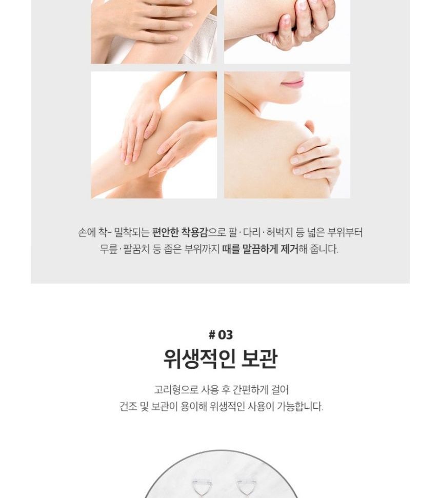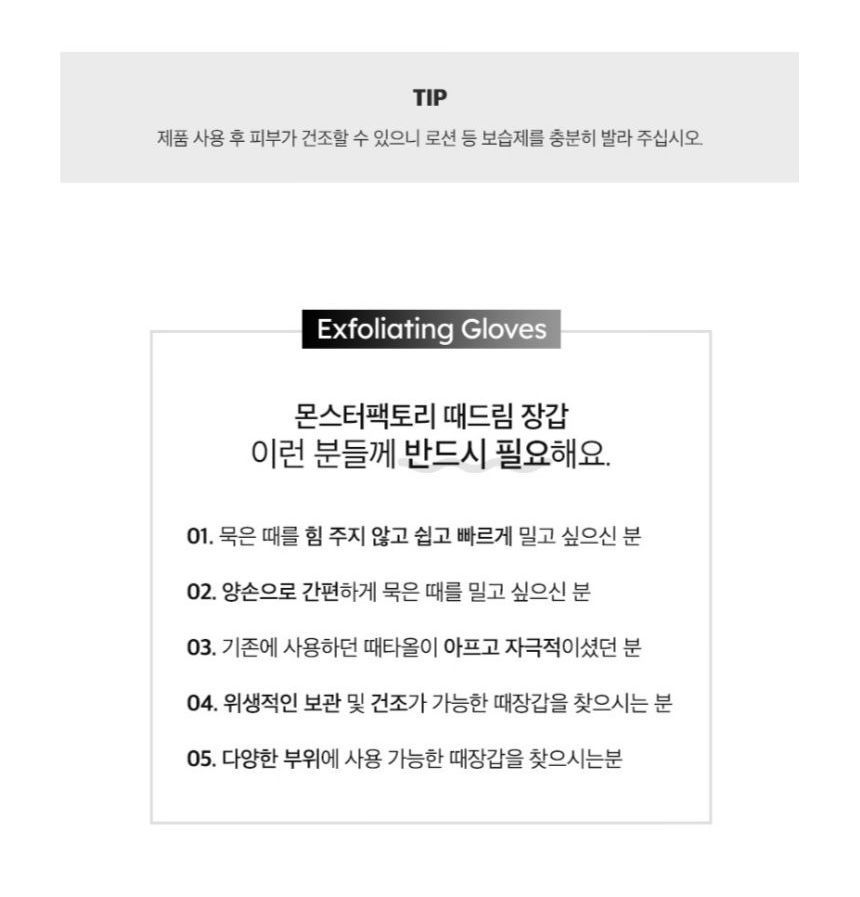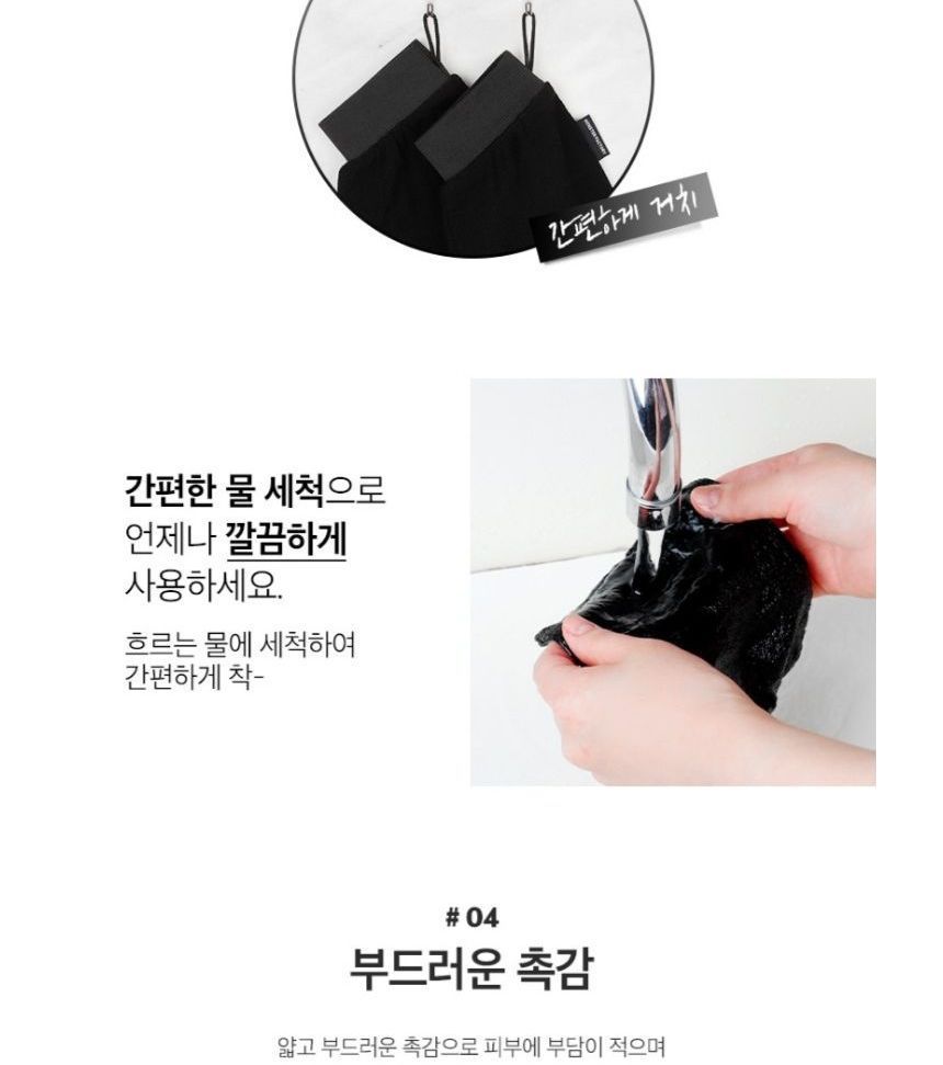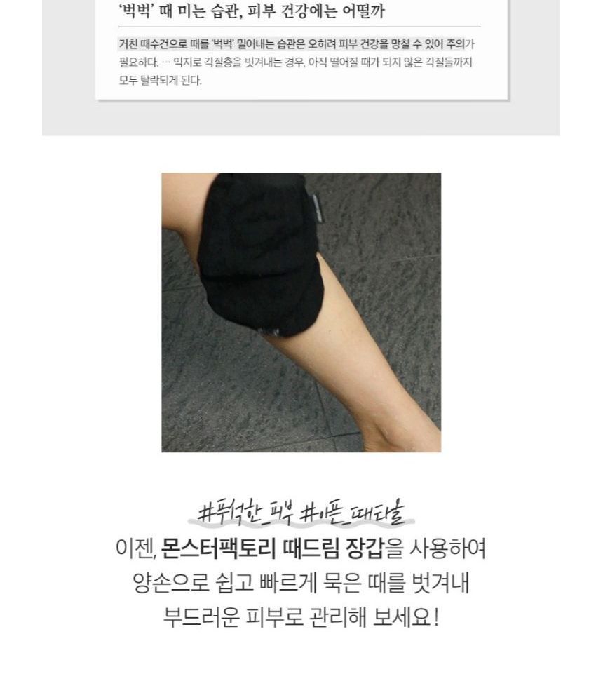 How to use: 1. Soak your skin into water for at least 15 minutes before use. 2. Dampen the gloves and gently massage. 3. Rinse with lukewarm water to clean the residue. 4. Apply a thicker layer of body lotion or body cream to moisturize the exfoliated area. |